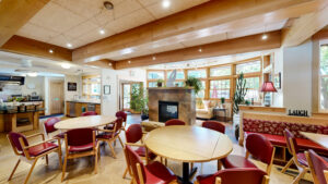 Silver Sage Village has a beautiful Common House that is available for classes, meetings, receptions, family reunions and other events for groups up to a maximum of 50 people. There are three connected areas on the main floor: a Gourmet Kitchen, a Dining Room that includes a double-sided fireplace with lounge area as well as access to our beautiful, outdoor courtyard and seating area, and a Library/Media Room. These rooms can be used separately or in combination.