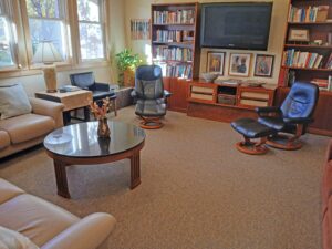 Use of the Library/Media Room includes a comfortable seating area with a large-screen TV and wireless Internet. Small groups of 10-12 people often have meetings here, and it is regularly used as a film venue and display area for First Friday Art Walks.